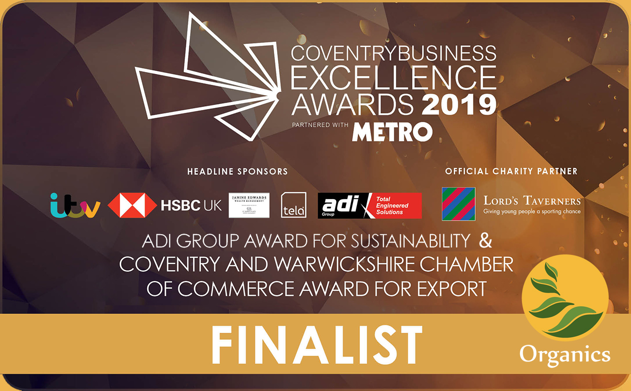 We, Organics, are proud to announce we have been nominated as a finalist in the adi Group Award for Sustainability Award and Coventry Chamber of Commerce Award for Export Award categories at this year’s Coventry Business Excellence Awards 2019.